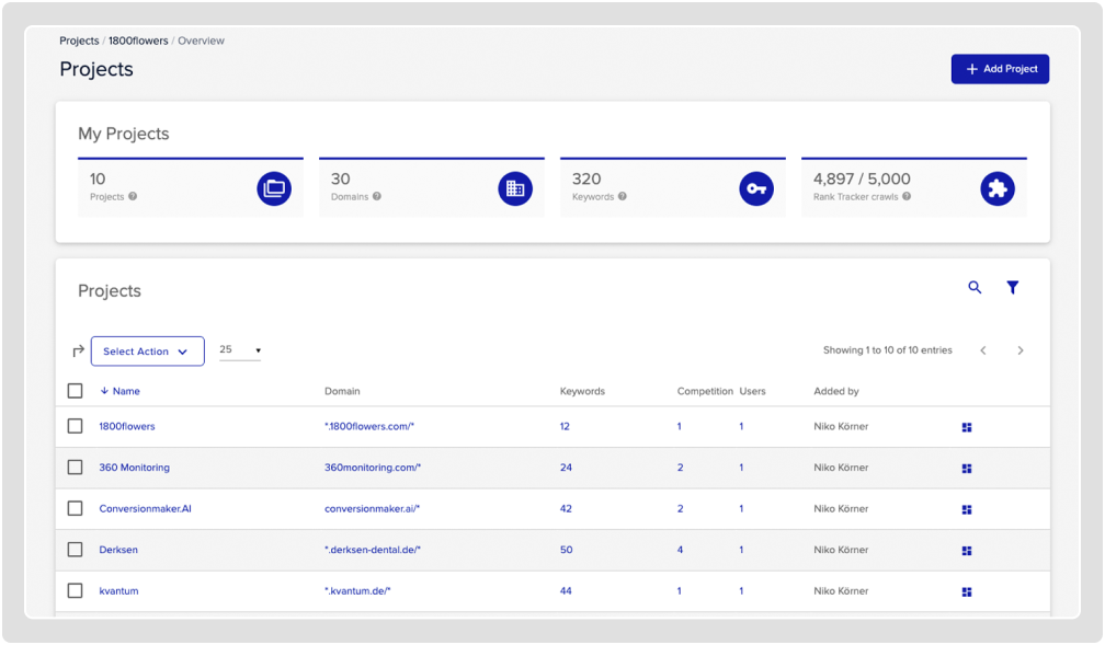 正如您可能已經知道,您也可以在排名跟踪器中跟踪競爭對手的排名。這樣,您也將獲得他們的項目可見性,從而進行更加逼真的比較。因此,即使他們的產品或服務組合略有不同,Project Visibility 也會專屬於您實際共享的關鍵字。